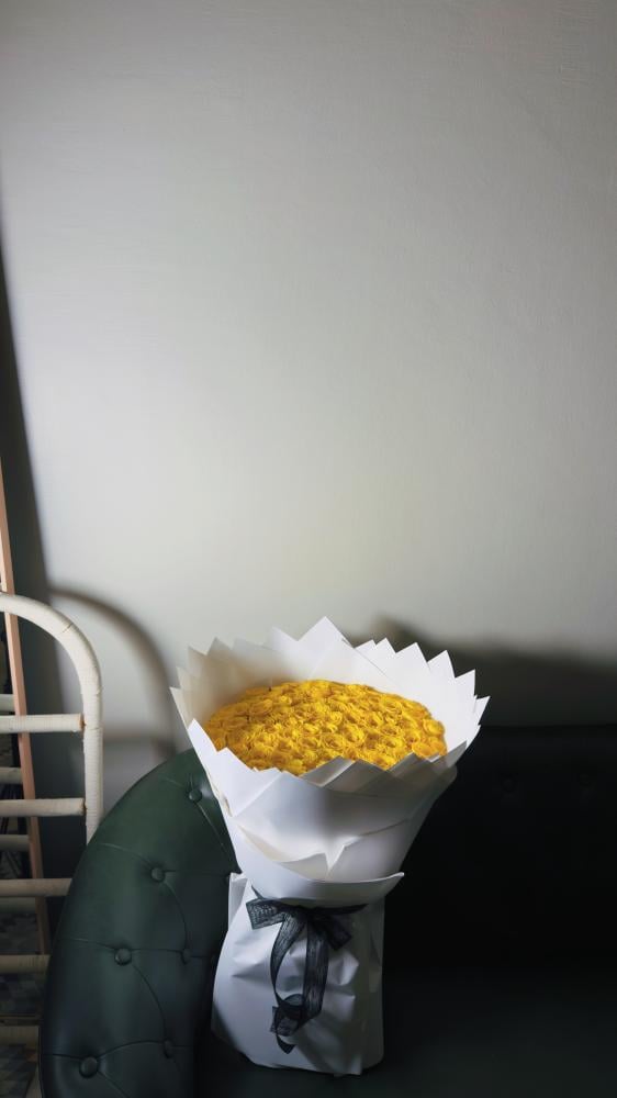 أضف لمسة من البهجة والفخامة مع هذه الباقة المميزة المكونة من 100 وردة جوري باللون الأصفر المشرق، مرتبة بعناية فائقة داخل تغليف أنيق باللون الأبيض مع شريط فاخر.