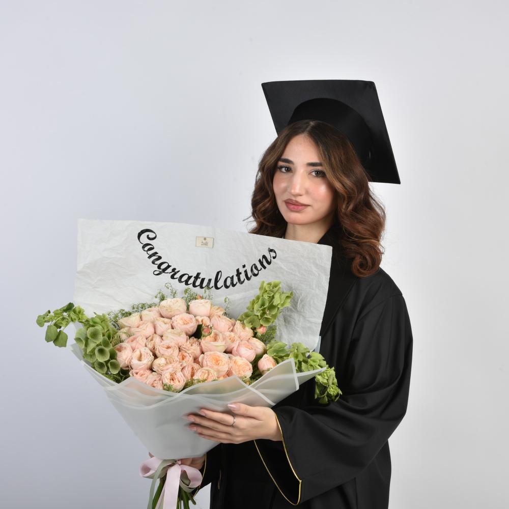 💐 بوكيه تخرج أنيق محمول بتغليف أبيض أنيق ومكتوب عليه "Congratulations"